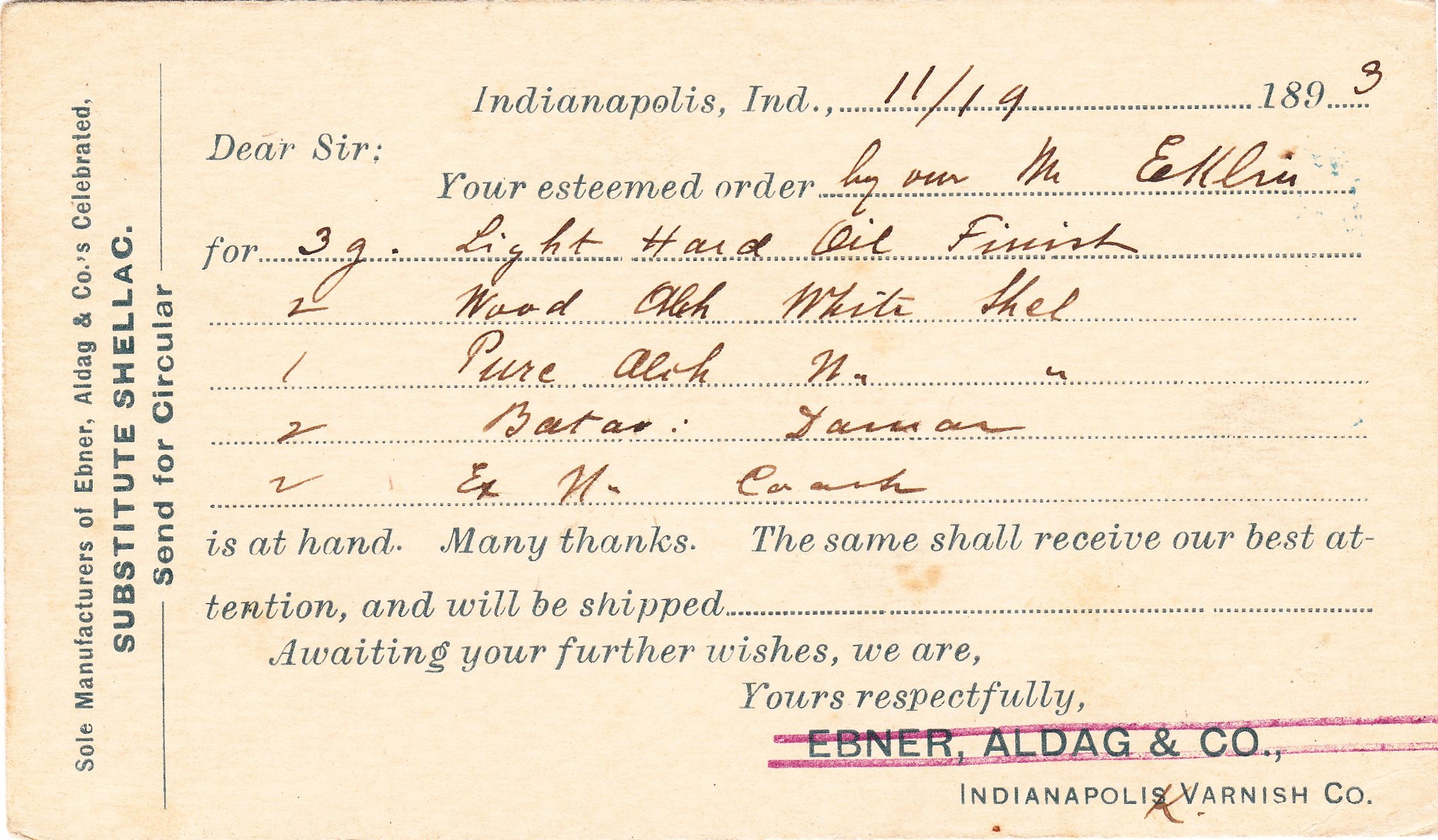 Der rückseitige Zudruck verweist auf ein Ersatzprodukt für Schellack, englisch SHELLAC, das von dieser Firma erfunden wurde.