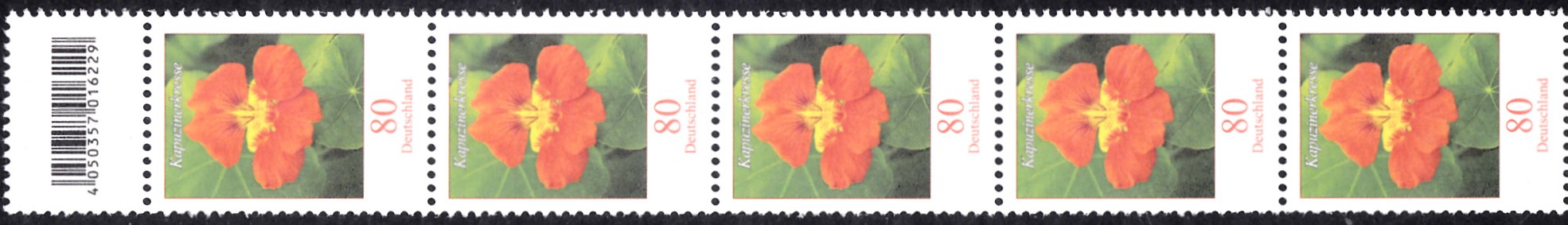 Streifen mit 5 Marken und EAN-Code der Marke mit der Kapuzinerkresse zu 80 Cent (MiNr 3469) aus der 200er-Rolle.