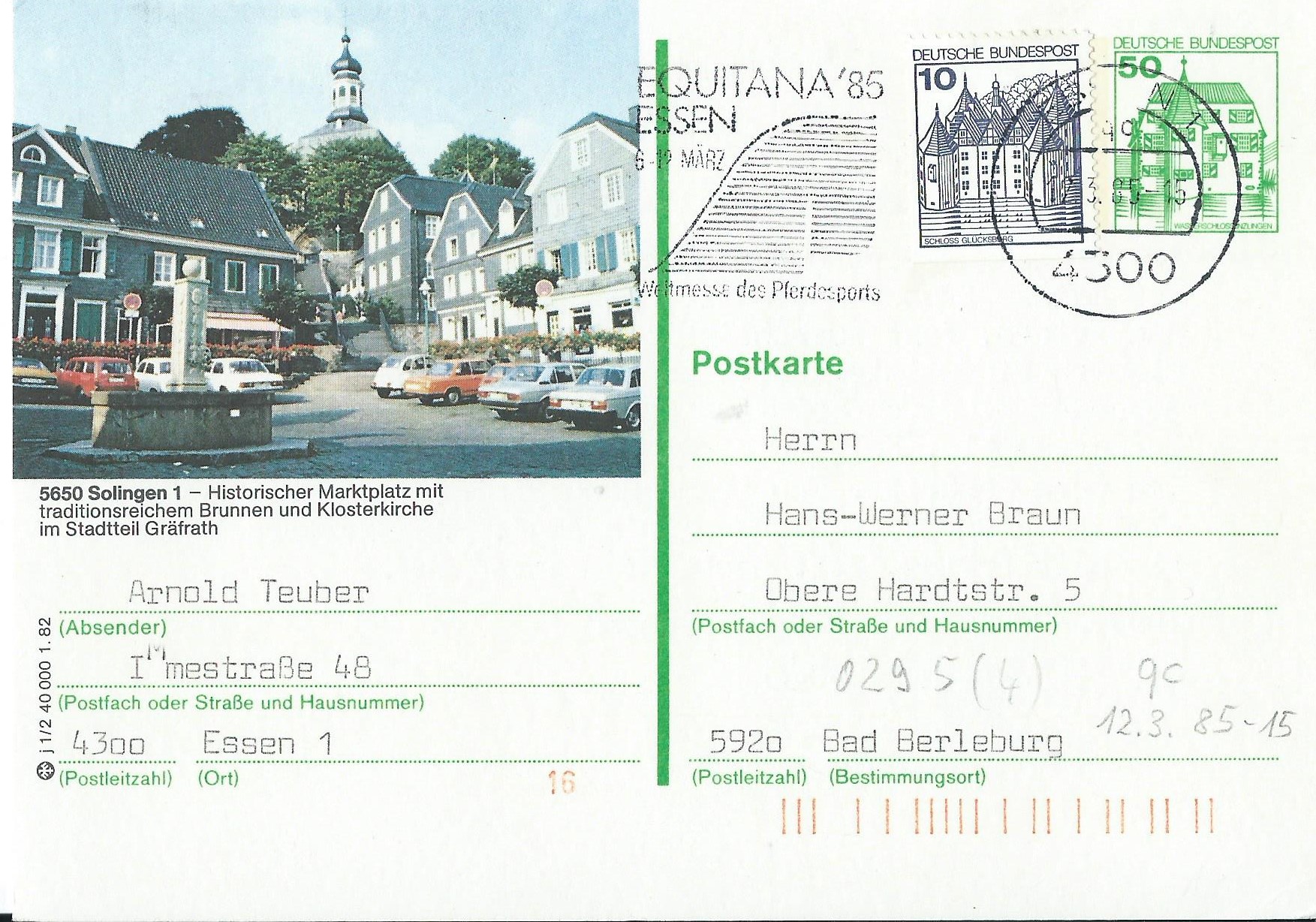 Einmal mit einer Ansicht aus Solingen, gestempelt am 12.3.85 mit einer 10 Pf Zusatzfrankatur: