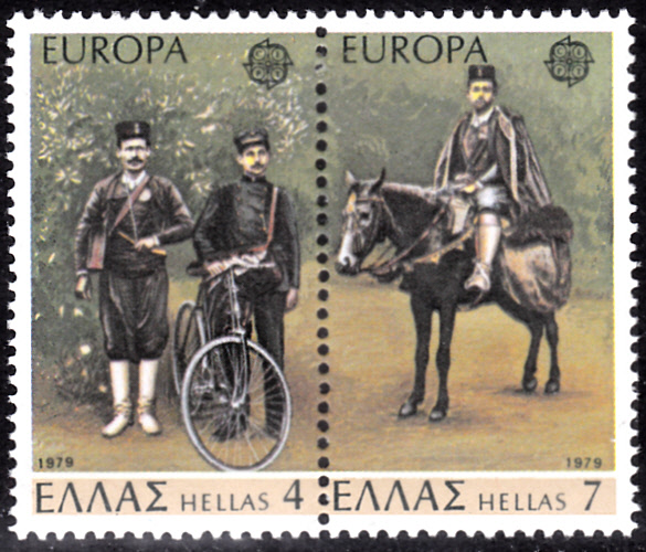 In Griechenland erschienen die Europamarken 1979 zum Gemeinschaftsthema "Geschichte des Post- und Fernmeldewesens" am 12. Mai 1979. Hier die Marke zu 7 Drachmen mit der Abbildung eines Postreiters. Die Auflage betrug 1 031 242 Stück.