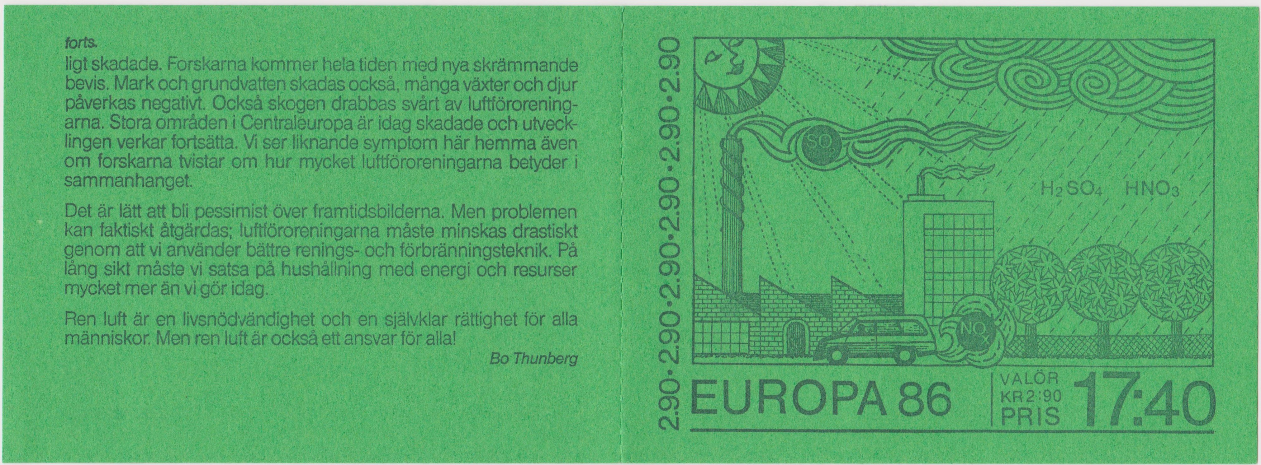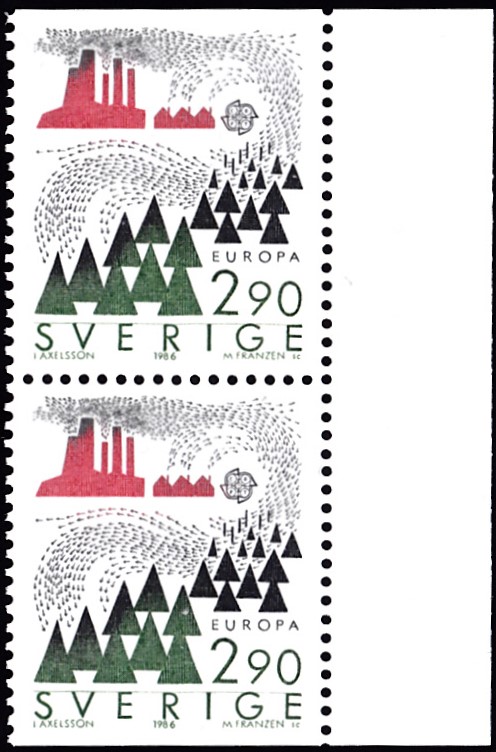In Schweden sind die Europamarken 1986 zum Gemeinschaftsthema "Natur- und Umweltschutz" am 27. Mai 1986 erschienen. Hier die Marke zu 2,90 Kronen mit einer Darstellung zum Thema Umweltverschmutzung durch Industrieabgase. Die Auflage betrug 8 100 000 Stück. Hier zeige ich eine oben nicht gezähnte Marke (MiNr 1398 Do).