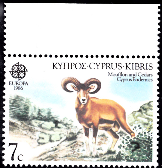 In Zypern sind die Europamarken 1986 zum Gemeinschaftsthema "Natur- und Umweltschutz" am 28. April 1986 erschienen. Hier die Marke zu 7 Cent mit der Abbildung eines Zyprischen Mufflon (Ovis ammon orientalis cyprius) und Zedern (Cedrus brevifolia). Die Auflage betrug 700 000 Stück.