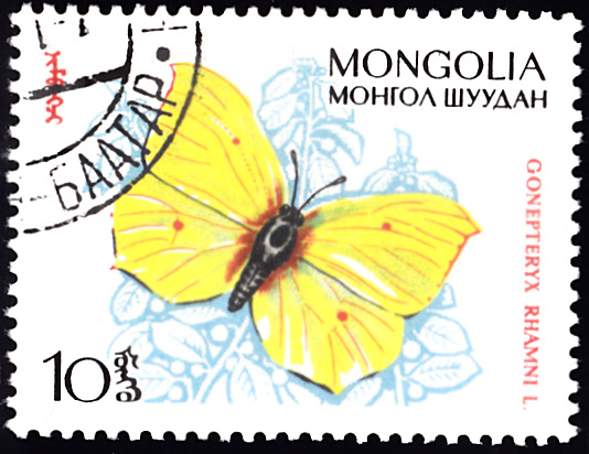 Aus der Mongolei kommt diese Marke (MiNr 337) mit einem weiteren Zitronenfalter (Gonepteryx rhamni).