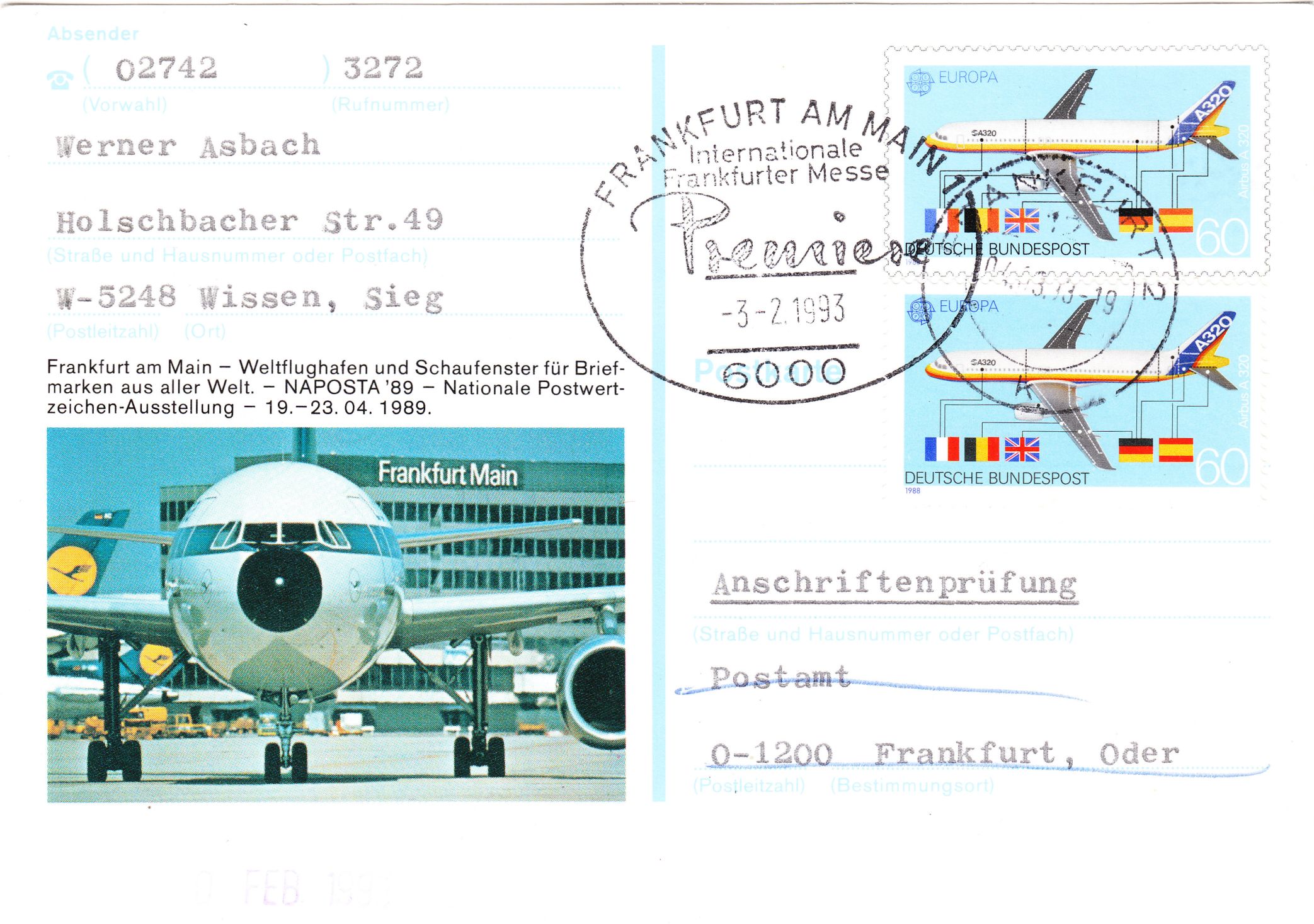Es handelt sich um eine Einzel-Anschriftenprüfung der Portostufe 120 Pfennig, dargestellt als Ganzsache mit Eindruck der Europamarke 1988 der Wertstufe zu 60 Pfennig mit bildgleicher Zusatzfrankatur einer MiNr. 1367, aufgegeben in Frankfurt am Main, gelaufen nach Frankfurt an der Oder.