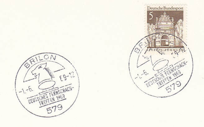 Das Deutsche Fernschachtreffen 1971 fand in Glücksburg statt. Von diesem Sonderstempel könnte es 2 Geräte geben, wenn man die "2" hinter "OSTSEE" in diese Richtung deutet. Das Stempeldatum aus dem Juni lässt eher ein gemütliches Beisammensein vermuten, als ein ehrgeiziges "Fernschachturnier". Obwohl Schachspieler Einzelkämpfer sind, vor allem als Fernschachspieler, wollen sie irgendwann aber wissen, wer ihre Partner bzw. Gegner sind.