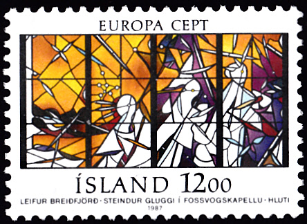 In Island erschienen die Europamarken 1987 zum Gemeinschaftsthema "Moderne Architektur" am 4. Mai 1987. Hier die Marke zu 12,00 Kronen mit einem Glasfenster von Leifur Breidfjörd (geb.1945) in der Fossvogskapelle in Reykjavík. Die Auflage dieser Marke betrug 1 500 000 Stück.