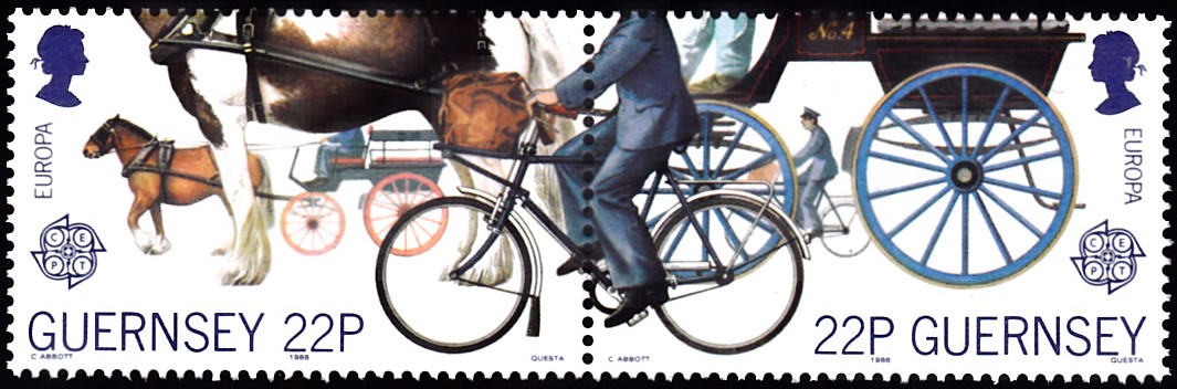 In Großbritannien-Guernsey erschienen die Europamarken 1988 zum Gemeinschaftsthema "Transport- und Kommunikationsmittel" am 10. Mai 1988. Hier eine Marke zu 22 Pence mit einem Teil eines Postbeamten auf einem Fahrrad und einem Postpferdefuhrwerk.