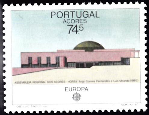 In Portugal Azoren erschien eine Europamarke 1987 zum Gemeinschaftsthema "Moderne Architektur" am 5. Mai 1987. Hier die Marke zu 74,50 Escudo mit der Abbildung des Gebäudes der Regionalversammlung in Horta von Manuel Correia Fernandes (geb. 1941) und Luís Miranda. Die Auflage der Marke beträgt 600 000 Stück.