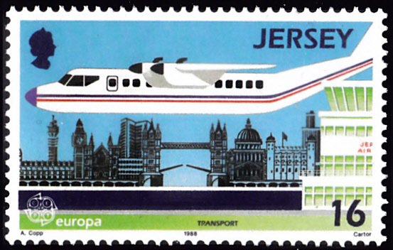 In Großbritannien-Jersey erschienen die Europamarken 1988 zum Gemeinschaftsthema "Transport- und Kommunikationsmittel" am 26. April 1988. Hier eine Marke zu 16 Pence mit einem Flugzeug De Havilland D.H.C. Dash Seven, Gebäude in London und dem Tower des Flughafens Jersey. Die Marke hatte eine Auflage von 881 324 Stück.