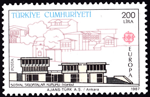 In der Türkei erschienen die Europamarken 1987 zum Gemeinschaftsthema "Moderne Architektur" am 28. April1987. Hier die Marke zu 200 Lira mit dem Gebäude der Sozialversicherung in Istanbul. Die Auflage der Marke beträgt 600 000 Stück.