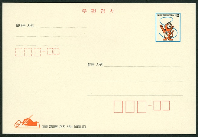 Auch 2 Postkarten für die vielen Ganzsachensammler weltweit brachte man an die Schalter, um mit den Wertzeichen "Emblem" und "Maskottchen" für die Spiele in Seoul zu werben.
