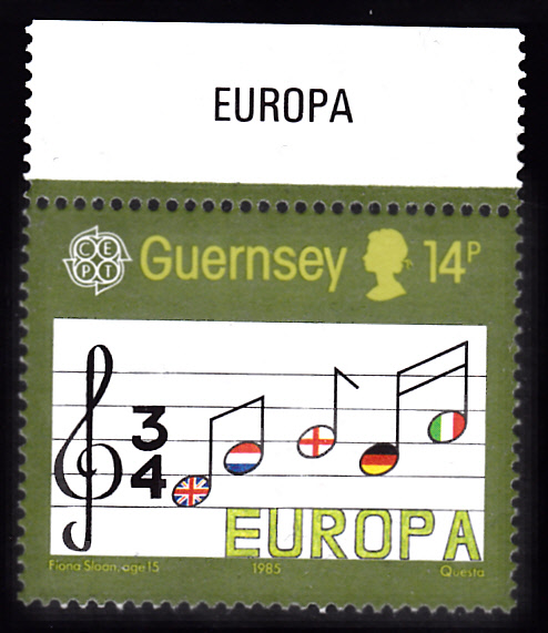 In Großbritannien-Guernsey erschien die Europamarken 1985 zu 14 Pence (MiNr 322) mit "Noten mit Flaggen europäischer Länder" nach Zeichnung von Fiona Sloan (15 J.).