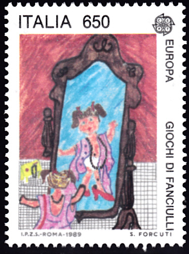 In Italien erschien auch diese Europamarke 1989 (MiNr 2079) mit der Kinderzeichnung "Mädchen vor Spiegel" von Serena Forcuti.