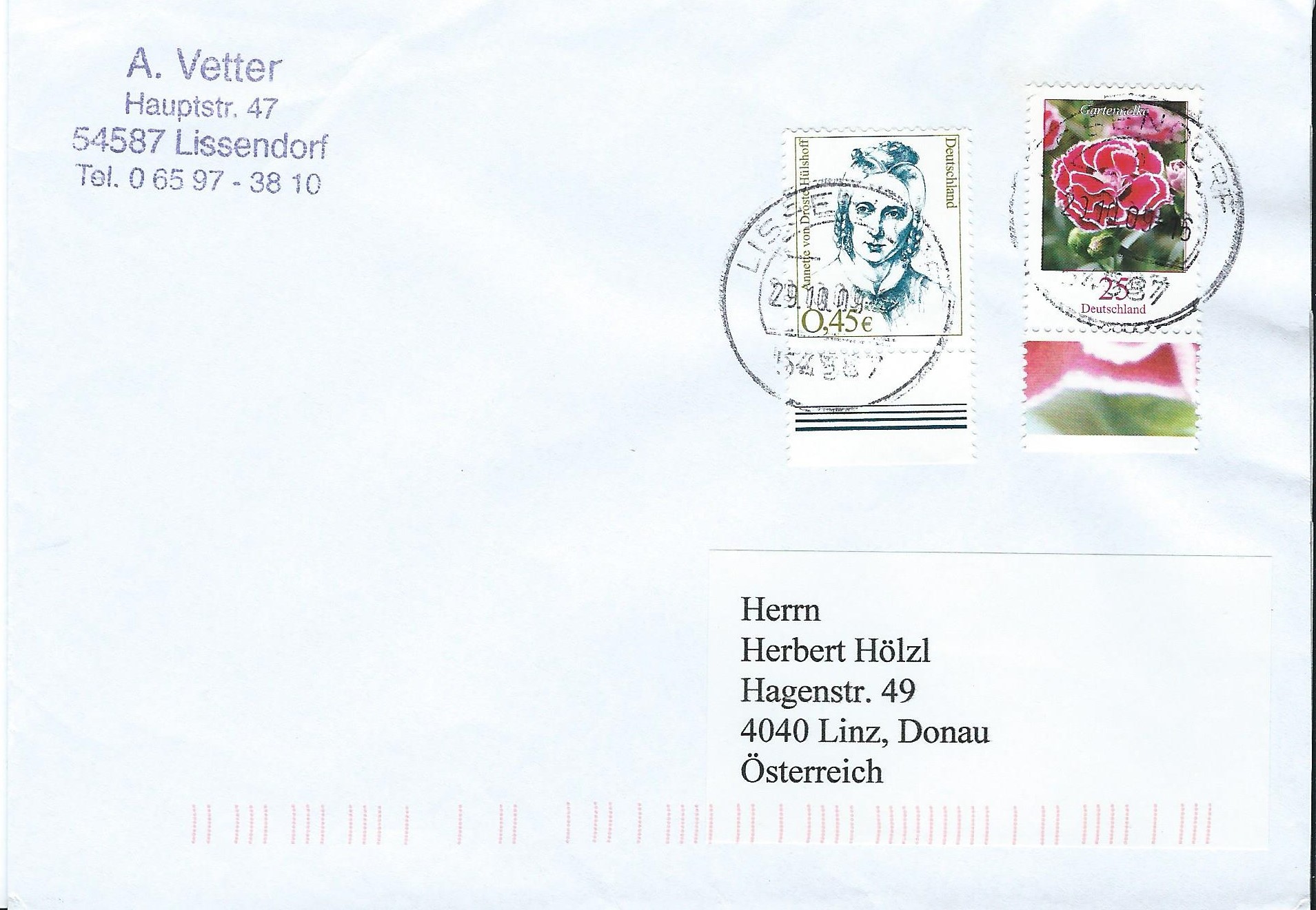 Es folgt eine Marke zu 25 Cent Gartennelke vom Unterrand nebst einer Beifrankatur zu 45 Cent Frauen ebenfalls vom Unterrand. Gestempelt wurde der Beleg in Lissendorf am 29.10.09, er lief als Auslandsbrief zu 70 Cent nach Österreich.