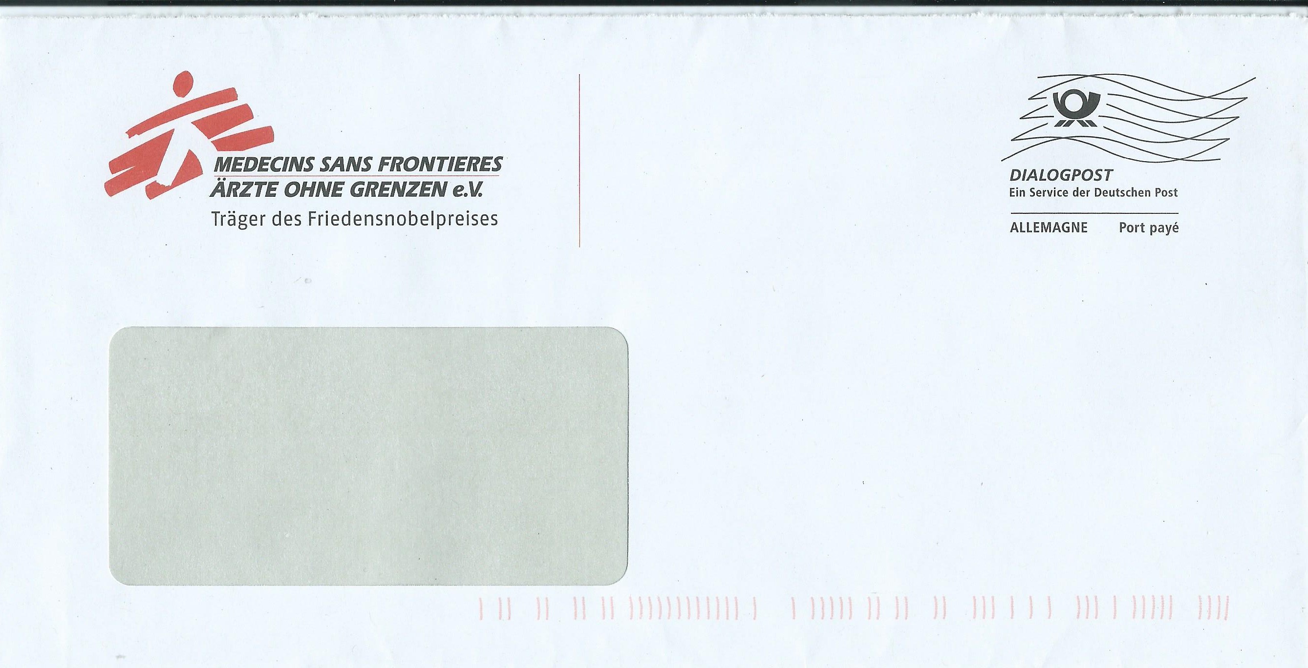 …und einmal von den Ärzten ohne Grenzen, ebenfalls mit Frankierwelle ohne markenähnlichen Zudruck: