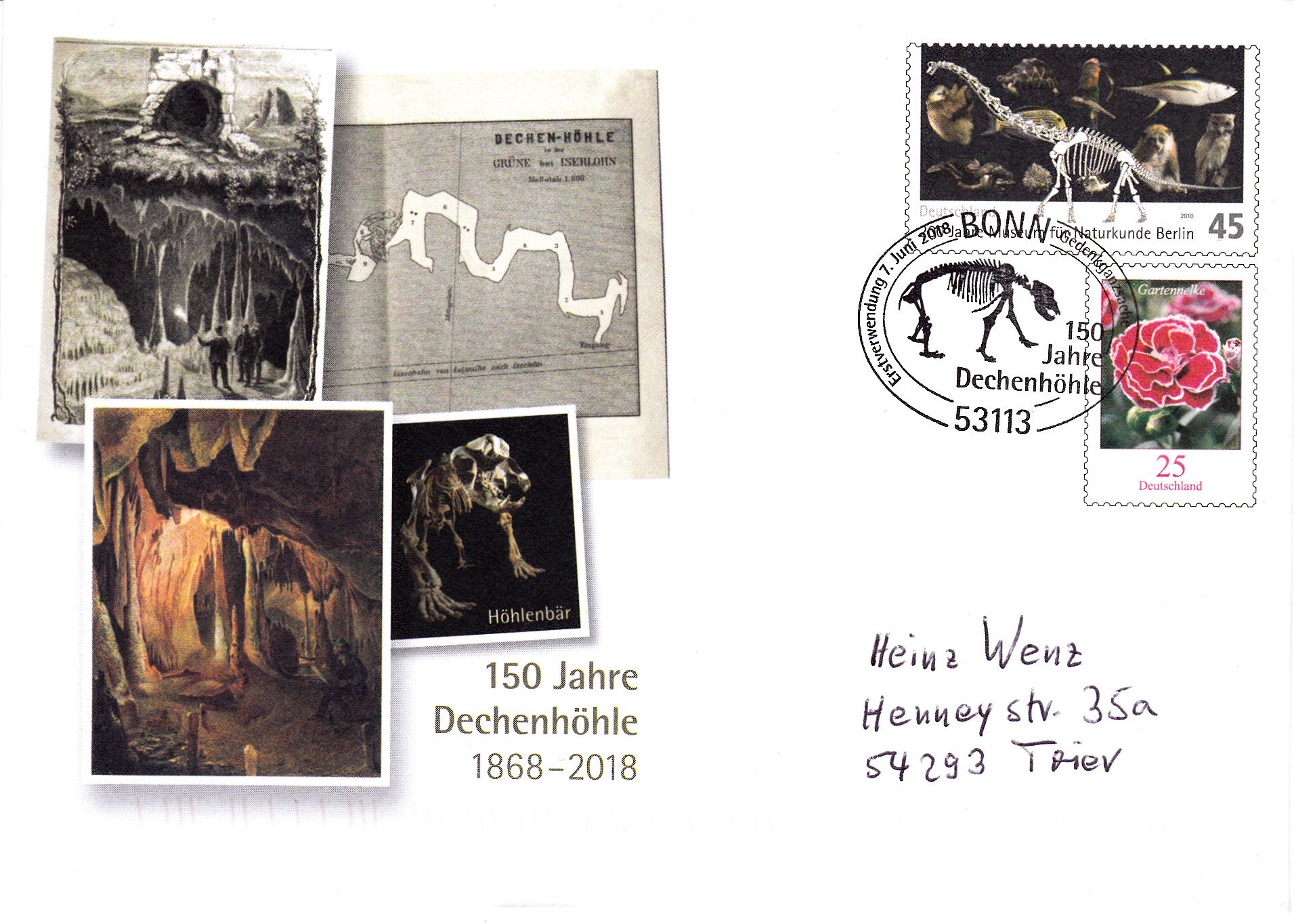 Zum Jubiläum "150 Jahre Entdeckung Dechenhöhle" erschien eine Gedenkganzsache mit einem Wertstempel der Marke zum Jubiläum "200 Jahre Museum für Naturkunde in Berlin" (MiNr 2775) mit der Abbildung eines Skelettes des Brachiosaurus brancai.