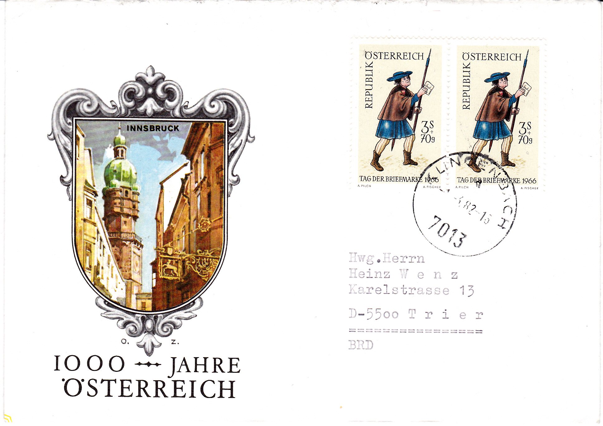 Brief per Eilboten von Wien nach Osnabrück frankiert mit drei Marken "Tag der Briefmarke 1966" und gestempelt mit einem Sonderstempel zum Tag der Briefmarke mit der Kennziffer "11". Rückseitig sind Ankunftsstempel "Düsseldorf Flughafen" und "Osnabrück" angebracht.
