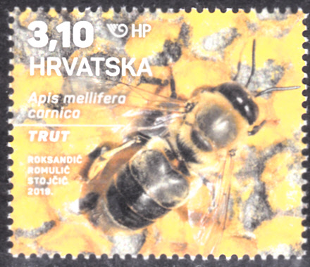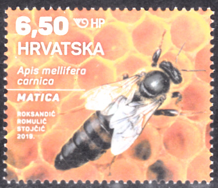 Auf dieser Marke aus Kroatien (MiNr 1365) wird eine Arbeiterin der Kärntner Biene (Apis mellifera carnica) gezeigt.