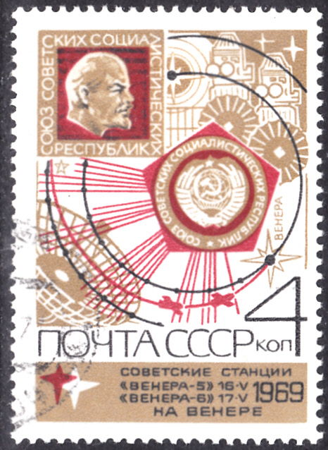 in der Sowjetunion ist diese Marke (MiNr 3694) erschienen, die auf die beiden Venussonden "Venera 5" und "Venera 6" und deren Landesonden hinweist. Die Marke zeigt Plaketten, eine Radarantenne und die Flugbahnen.