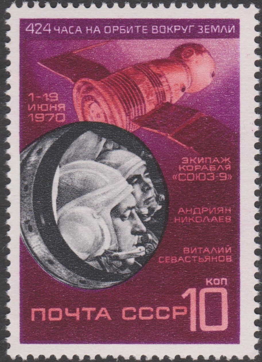 Zum Weltraumflug von Sojus 9 ist in der Sowjetunion eine Marke (MiNr 3779) mit der Abbildung der Kosmonauten Andrijan Nikolajew (1929-2004) und Witalij Sewastjanow (1935-2010) und dem Raumschiff Sojus 9 erschienen.