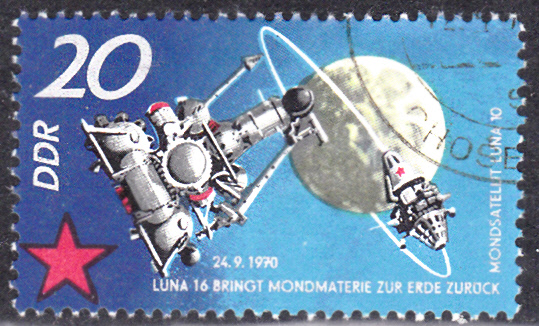 Auf dieser Marke der DDR (MiNr 1638) ist auch Luna 16 zu sehen.