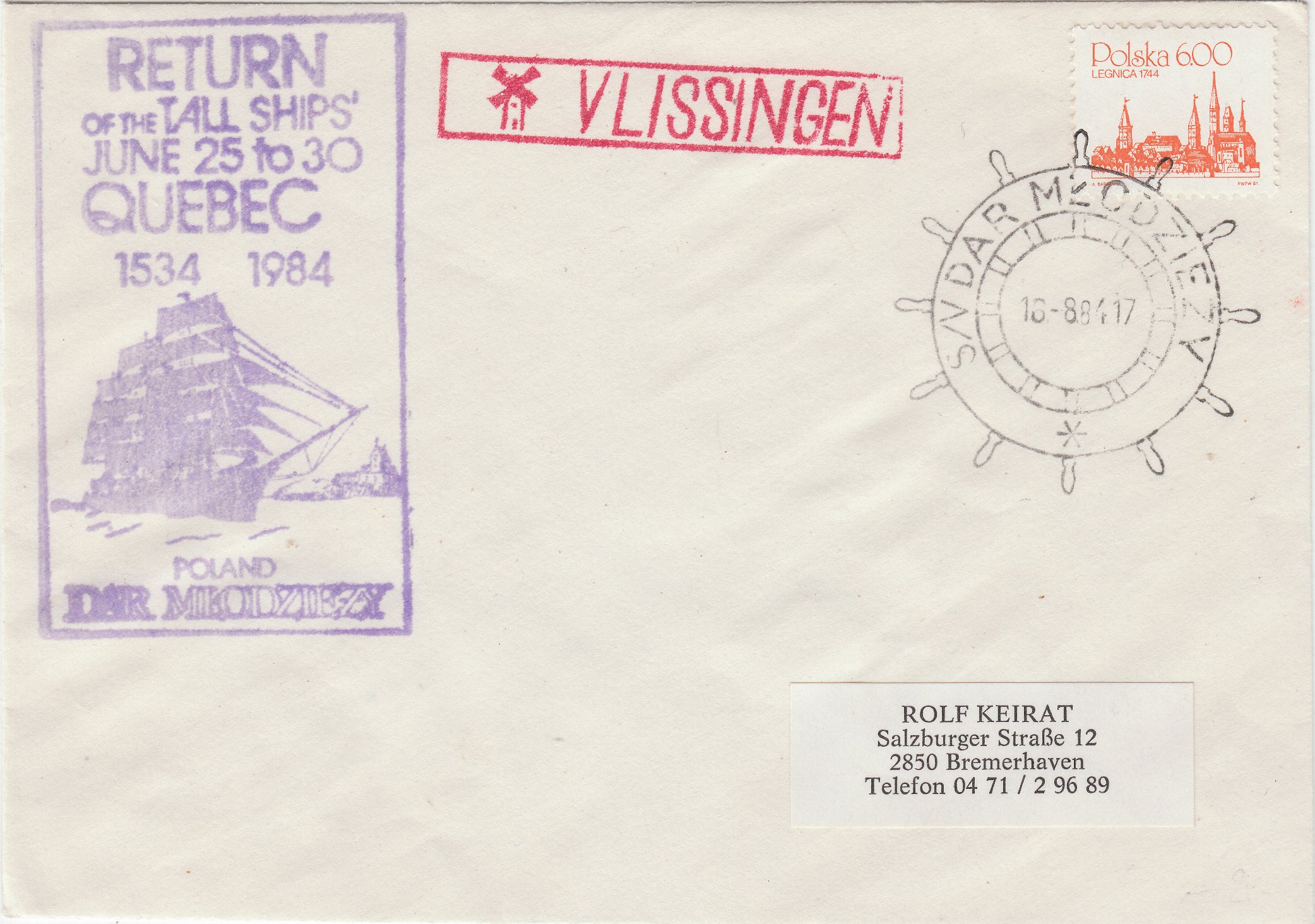 Dokumentiert wurde per Cachetstempel in Violett die Rückkehr der DAR MLODZIEZY von den TALL SHIPS' RACES, die 1984 vom 25.06. bis zum 30.06. in Quebec, Kanada, stattfanden.