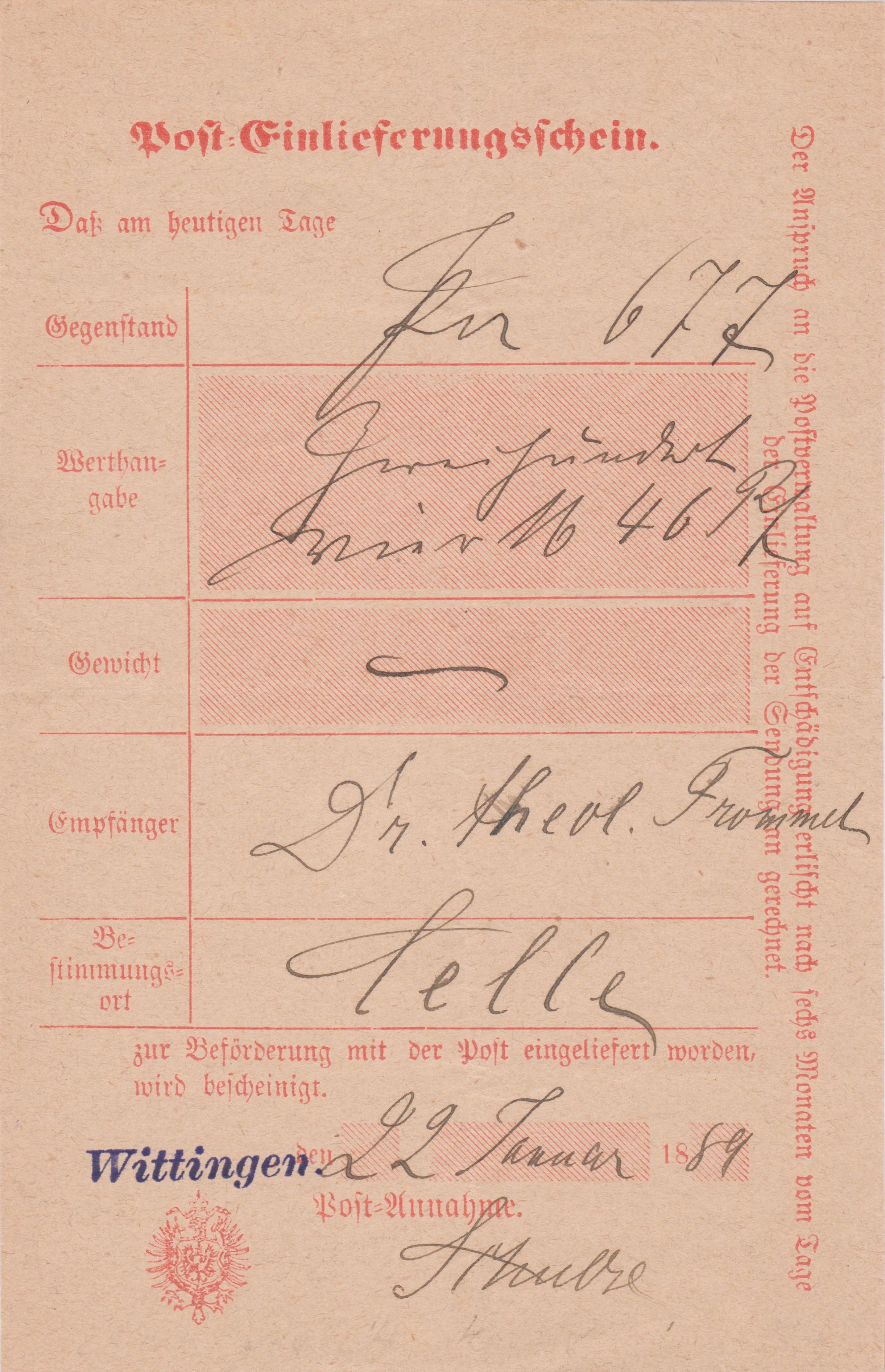Hier ein Formular "Post-Einlieferungsschein." mit einem Reichsadler mit Brustschild sowie vorgedrucktem Jahrhundert "18", gebraucht am 22.01.1889 in "Wittingen":