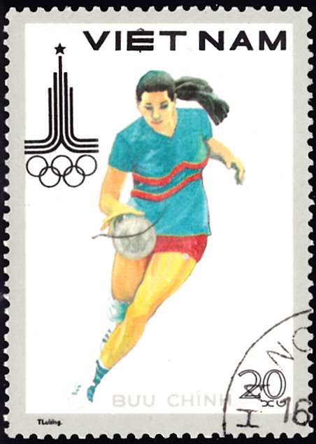 Auf dieser Marke aus Vietnam (MiNr 1095) zu den Sommerspielen in Moskau wird eine Basketballspielerin gezeigt.