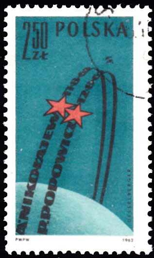 Die beiden bildgleichen Marken "Eroberer des Weltalls" der Sowjetunion zeigen die Skulptur "Ins Weltall" von Grigorij Postnikow (1914-1978, Bildhauer) und Namen der Raumschiffe Wostok 2, Wostok 3 und Wostok 4.