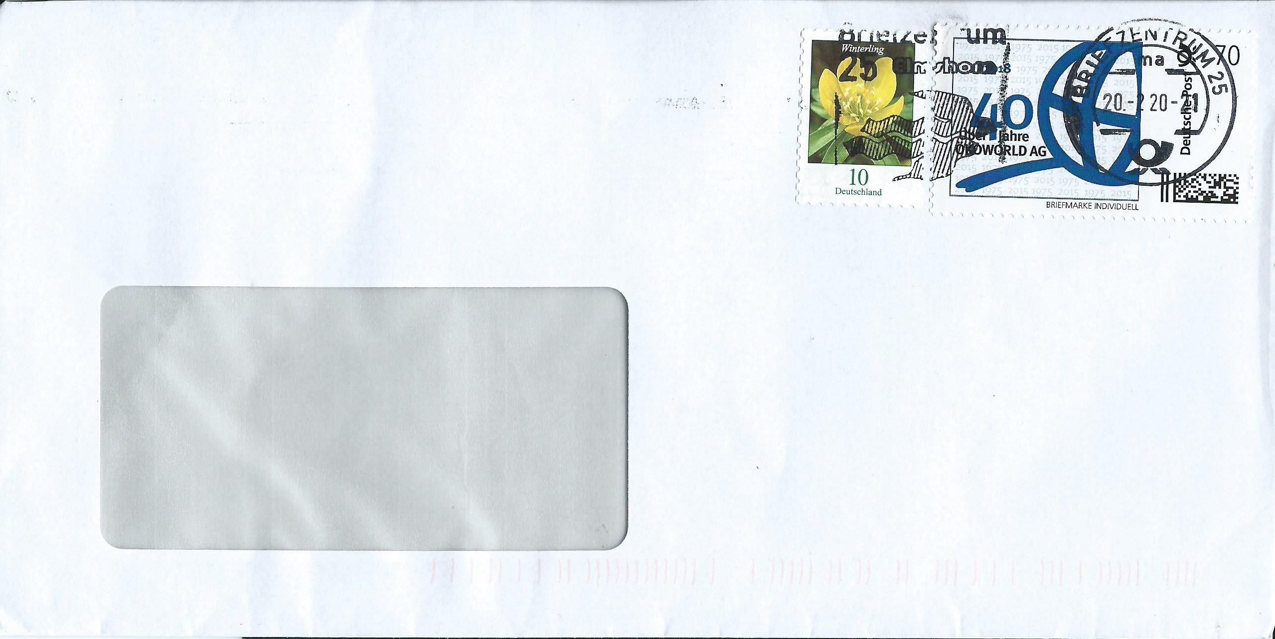 von der Marke Individuell hier ein Neuzugang: Über 40 Jahre Ökoworld AG hat sich auf dieser Marke zu 70 Cent verewigt. Sie klebt neben einer Blumenmarke zu 10 Cent auf einem Standart-Brief und wurde am 20.2.20 im Briefzentrum 25 gestempelt.