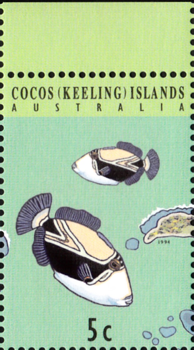 Auf dieser Marke der Kokos-Inseln (MiNr 314) sind neben einer Suppenschildkröte auch vier Gelbe Pyramidenfalterfisch (Hemitaurichthys polylepis) zu sehen.