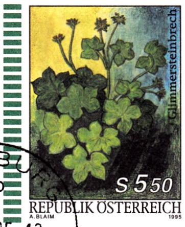Auf dieser Ganzsachenkarte aus Österreich wird im Wertstempel und auf der Karte Glimmer-Steinbrech (Saxifraga paradoxa) gezeigt.