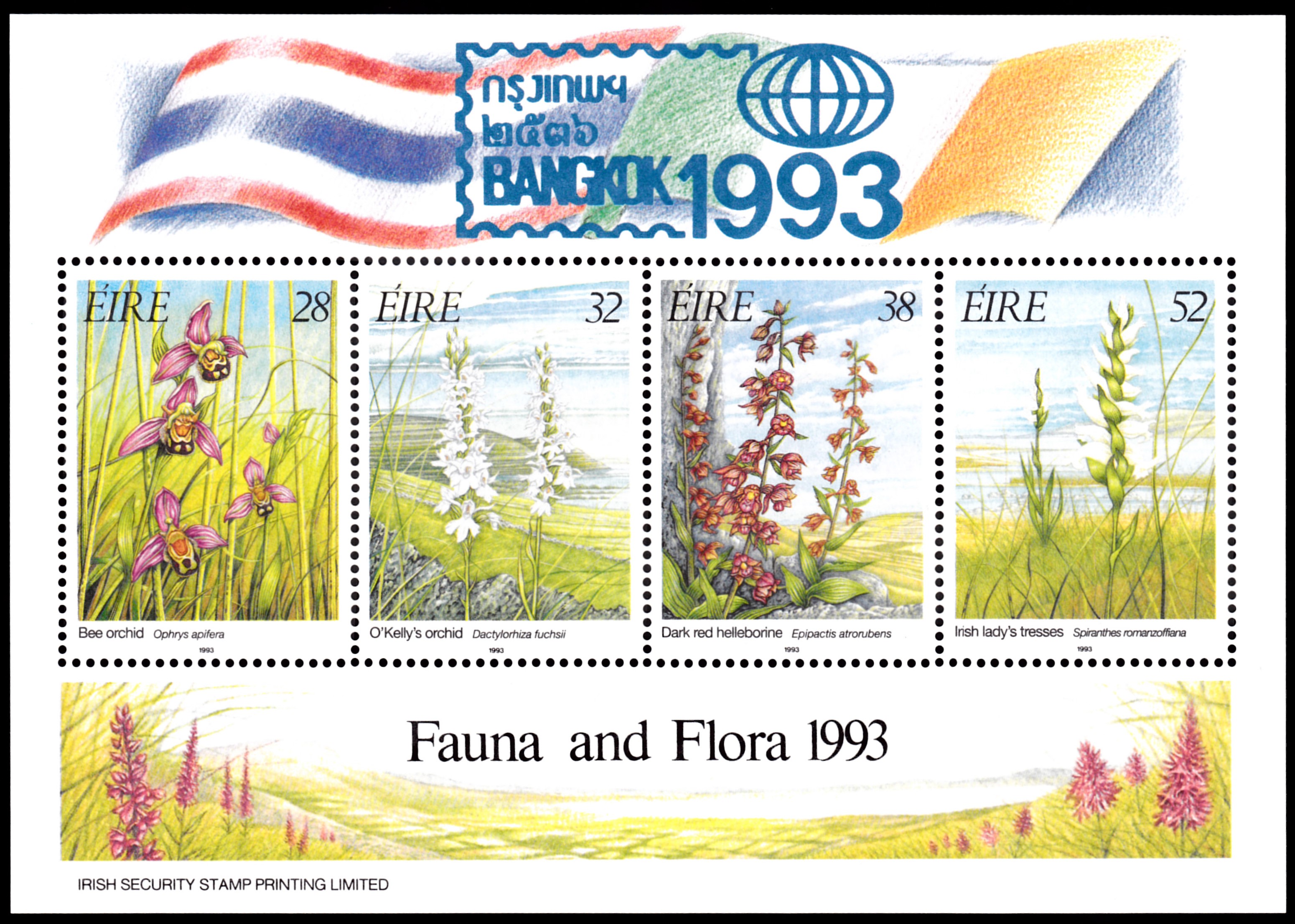 Diese Marke ist auch zusammen mit drei weiteren Marken mit Orchideen in einem Block erschienen. den Block gibt es in zwei Größen: I = 130 x 71 mm und II = 130 x 91 mm. Der Block 10 II weist auf dem größeren oberen Blockrand den Zudruck des Emblems der Internationalen Briefmarkenausstellung BANGKOK ’93 sowie der Staatsflaggen von Thailand und Irland auf. Dieser Block wurde nur auf dem Ausstellungspostamt der irischen Post und von der Versandstelle verkauft.