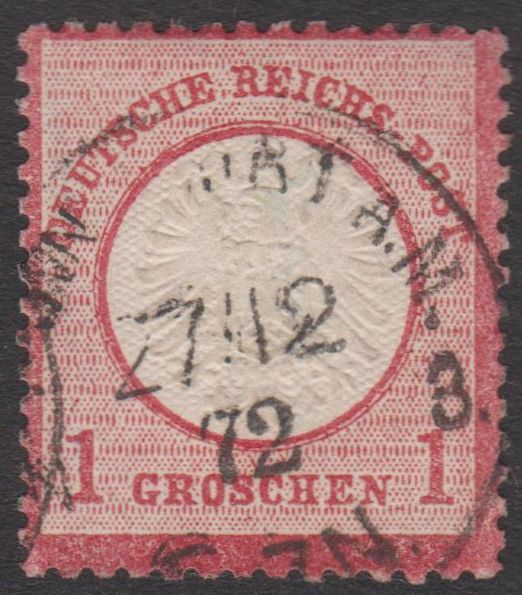 Hier eine MiNr. 19, währungsfremd als Groschenmarke im Kreuzergebiet am 27.12.1872 in Frankfurt am Main verwendet, dort entwertet per Kreisstempel "FRANKFURT A. M. N 3.", das ist ein Reichsablöser, Übergangsstempel mit Kontrollnummer, Michel Gruppe II/13/2, im Text "A" als Kapitälchen und das "N 3." steht auseinander gezogen: