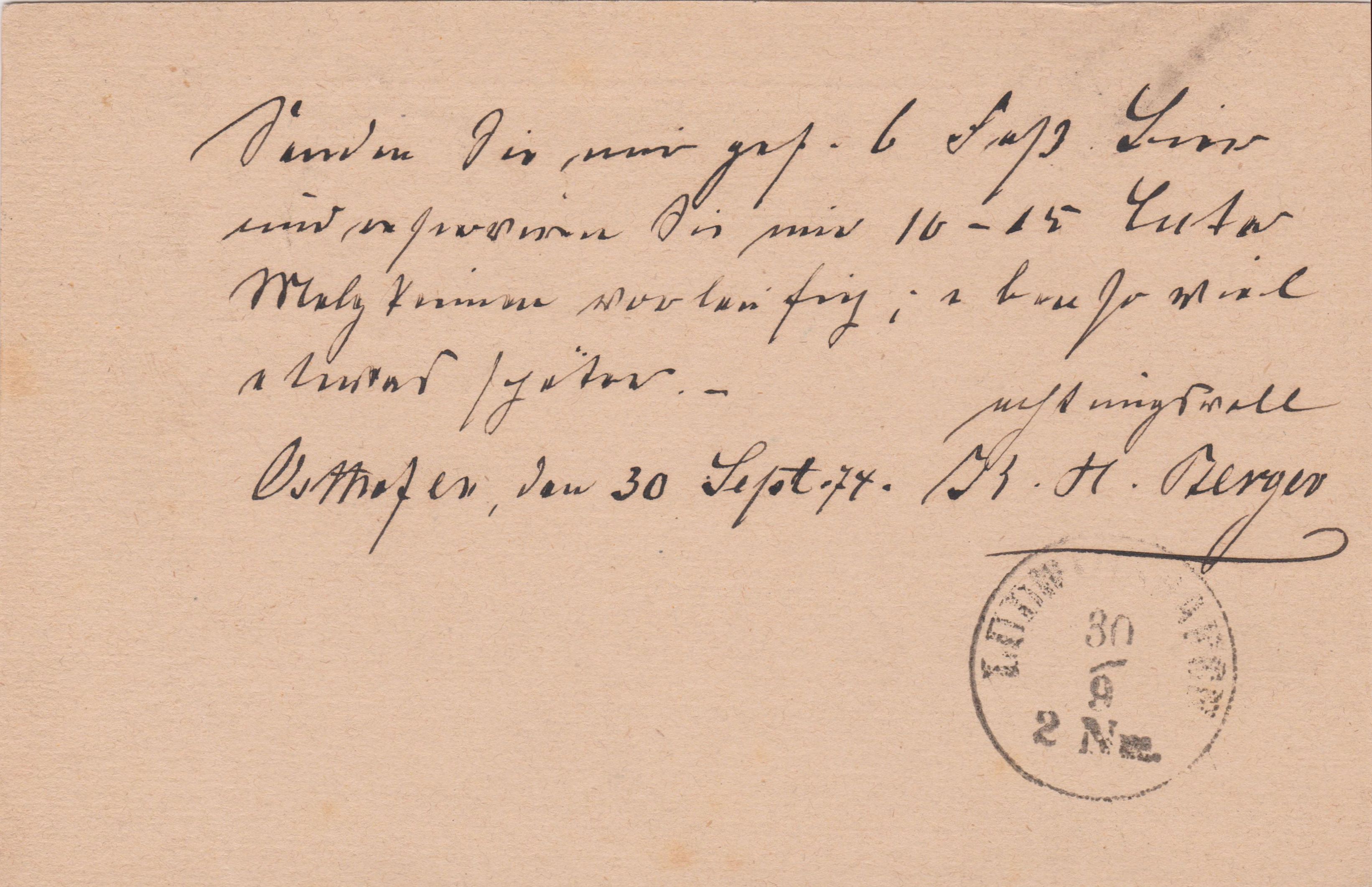 Hier eine Ganzsache MiNr. P 2, entwertet am 30.09.1874 per nachverwendetem Thurn & Taxis-Kreisstempel "OSTHOFEN", Haferkamp Nr. 3 = Feuser TT 398; Großherzogtum Hessen. Type ohne Jahreszahl, mit Tag/Monat/Stunden/VN":