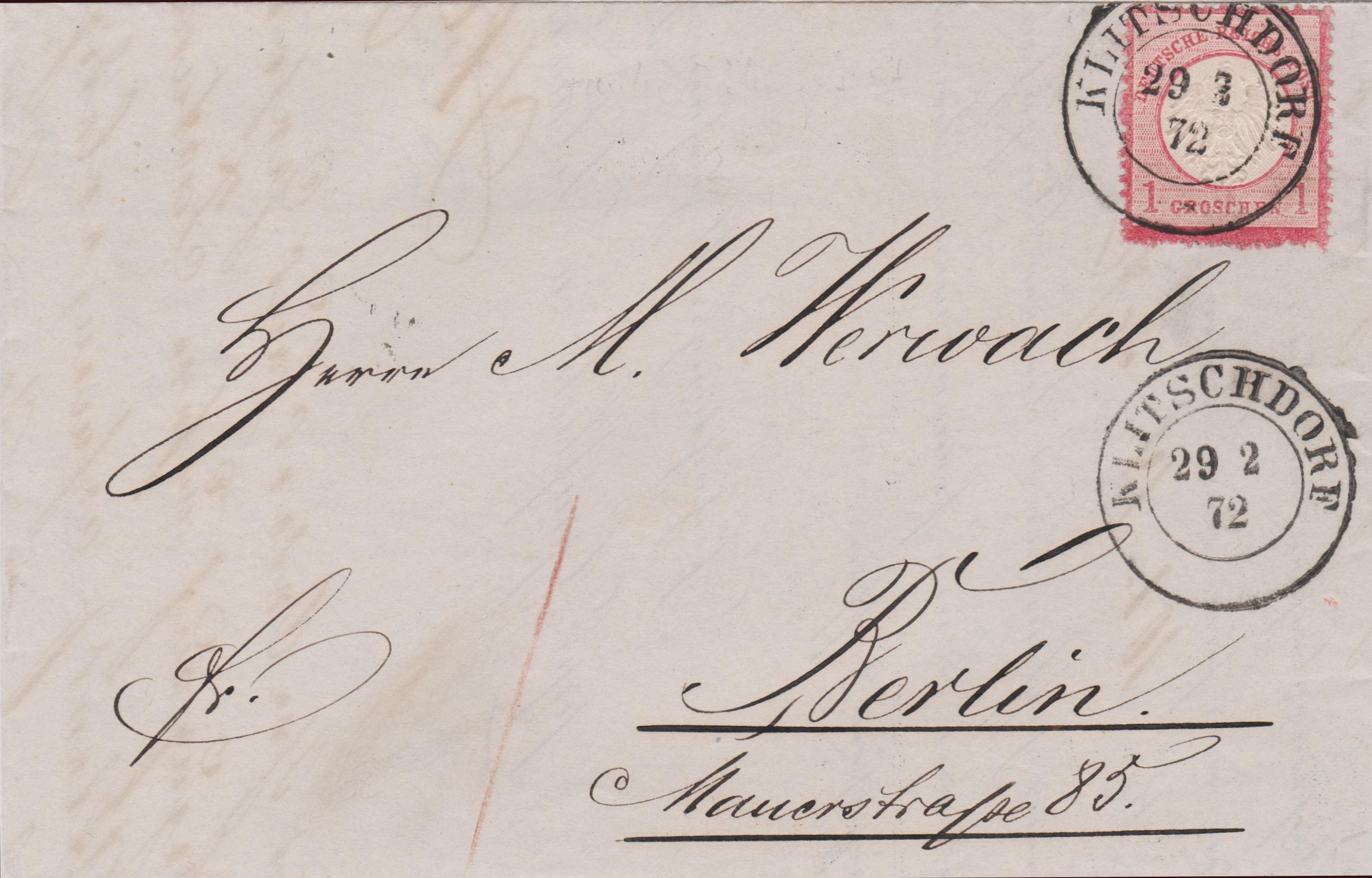 Hier eine Einzelfrankatur der MiNr. 4 mit teils rauer Zähnung auf Brief, adressiert nach Berlin, aufgegeben am 29.02.1872 als dem einzigen Schalttag während der Gültigkeit der Brustschildmarken, entwertet per nachverwendetem, preussischem Zweikreisstempel "KLITSCHDORF", Feuser Pr 1693: