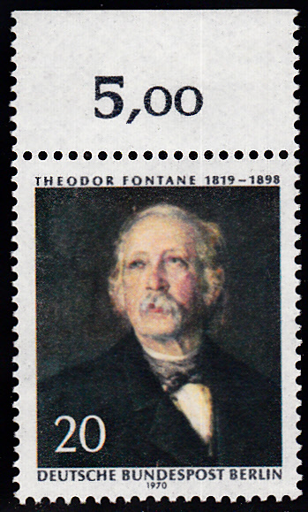 Zum 175.Geburtstag ist diese Marke (MiNr 1767) mit einem Porträt von Fontane nach einer Kreidezeichnung von Max Liebermann vor einem Ausschnitt aus einem seiner "Preußenlieder" erschienen.