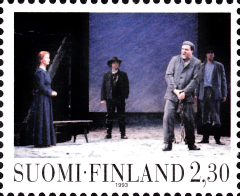 Auf einer Marke aus Finnland (MiNr 1229) zur Eröffnung des Opernhauses Helsinki wird eine Szene aus der Oper "Pohjolaisia" von Leevi Madetoja gezeigt.