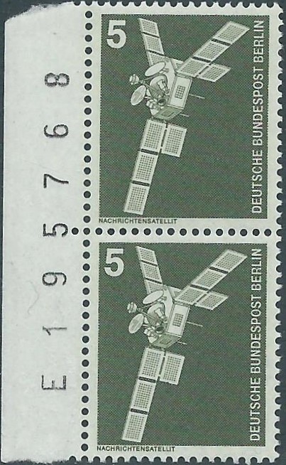 hier kann ich ein postfrisches senkrechtes Paar vom linken Bogenrand zu 5 Pf zeigen. Auf dem Bogenrand ist noch die Bogenzählnummer in Form von Buchstabe „E“ und einer 6-stelligen Nummer zu sehen.