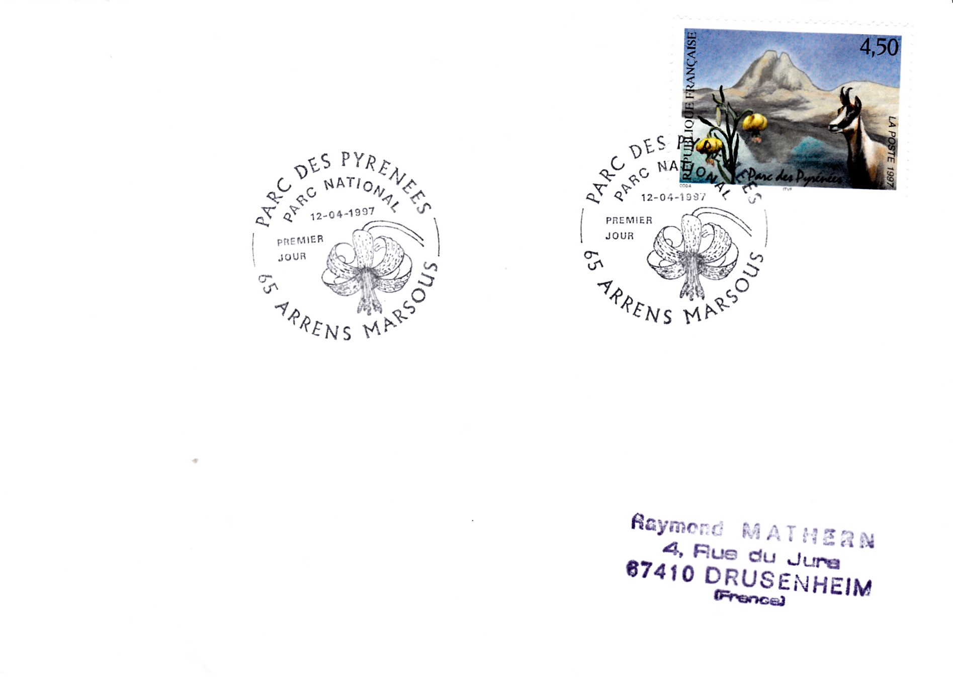 Auch im Ersttagsonderstempel aus Arrens Marsours vom 12.4.1997 wird eine Blüte der Pyrenäen-Lilie (Lilium pyrenaicum) gezeigt.
