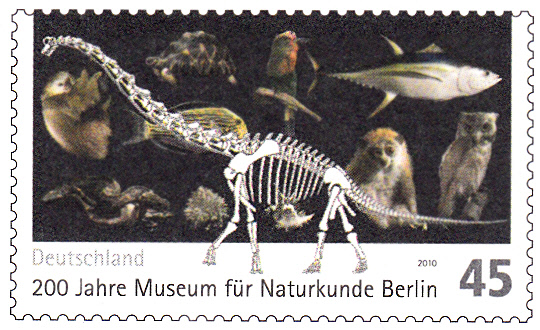 Zum Jubiläum "150 Jahre Entdeckung Dechenhöhle" erschien eine Gedenkganzsache mit einem Wertstempel der Marke zum Jubiläum "200 Jahre Museum für Naturkunde in Berlin" (MiNr 2775) mit der Abbildung eines Skelettes des Brachiosaurus brancai.