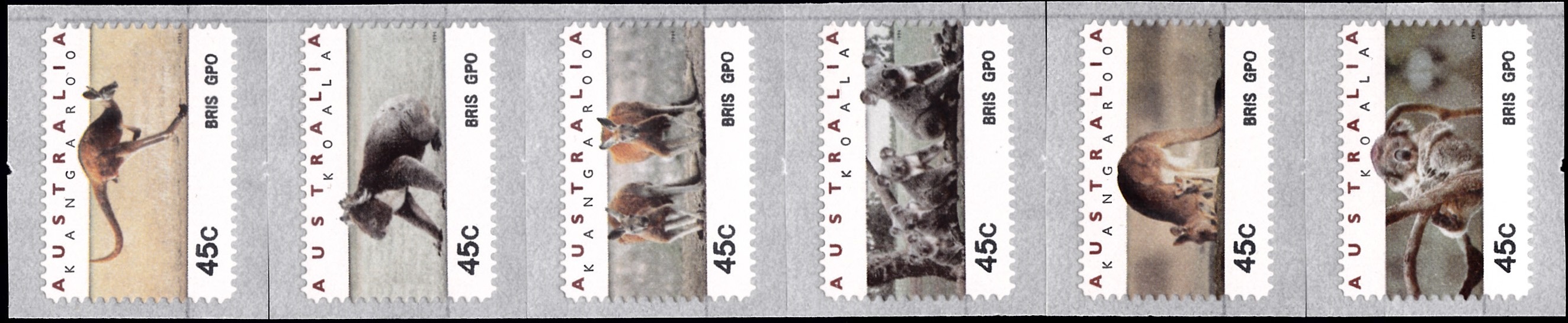 Diese sechs Marken befinden sich in wiederholender Folge auf der Trägerfolienrolle. Die Trägerfolienabschnitte der einzelnen Marken hängen an einem ca. 1 mm breiten Steg zusammen. Hier zeige ich einen kompletten Sechserstreifen.