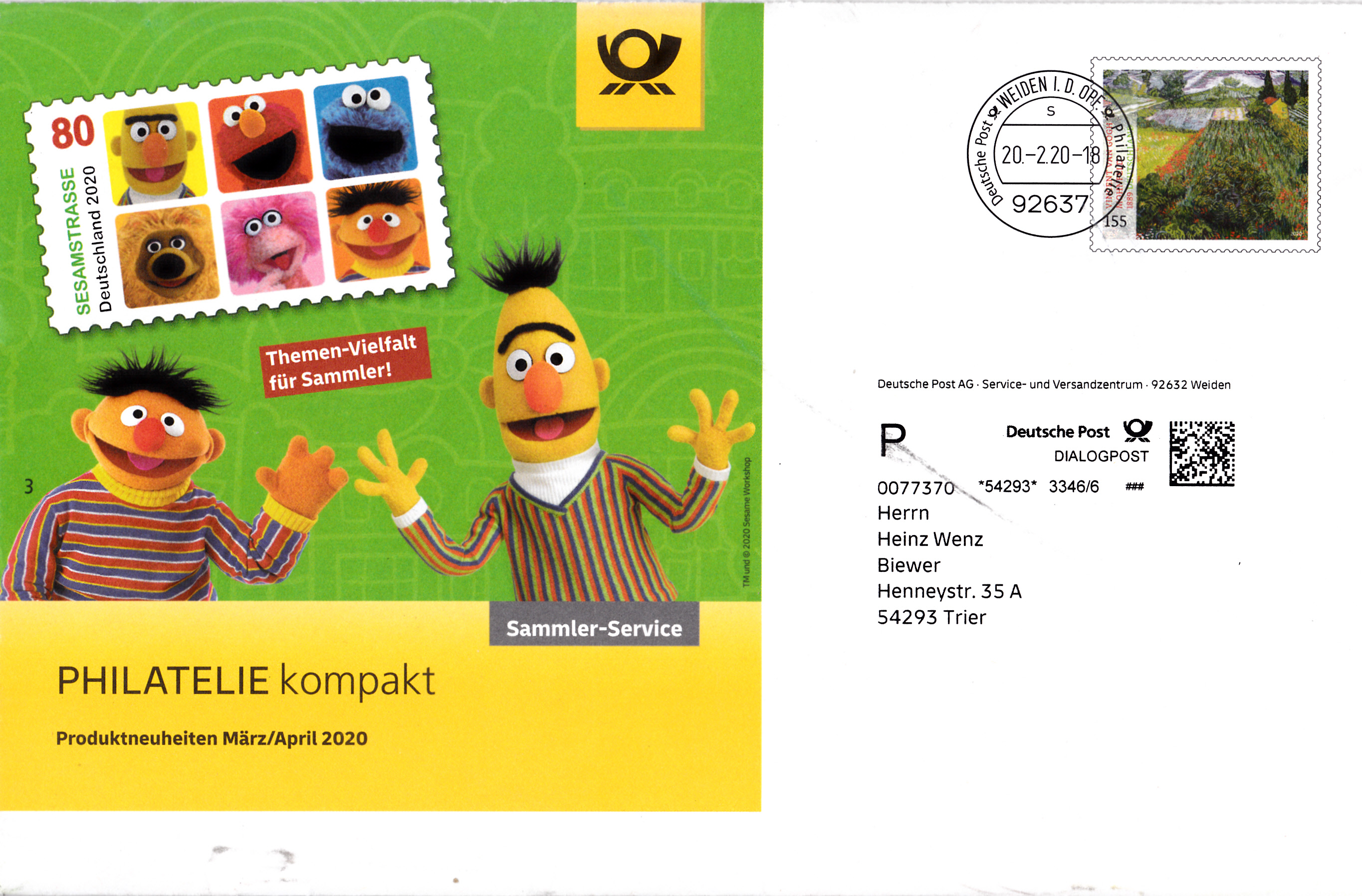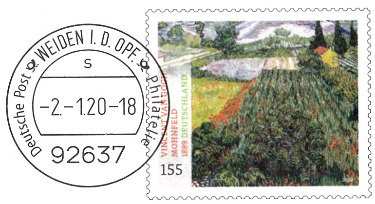 Umschlag im Format 229x162 mm mit einem Wertstempel mit der 155 Cent Marke (MiNr 3512) mit dem Gemälde "Mohnfeld" von Vincent van Gogh aus der Serie "Schätze aus deutschen Museen" mit aufgedruckter Zähnung und Vorausentwertung "Deutsche Post (Posthorn) WEIDEN I.D.OPF (Posthorn) Philatelie/ s / -2.-1.20-18".