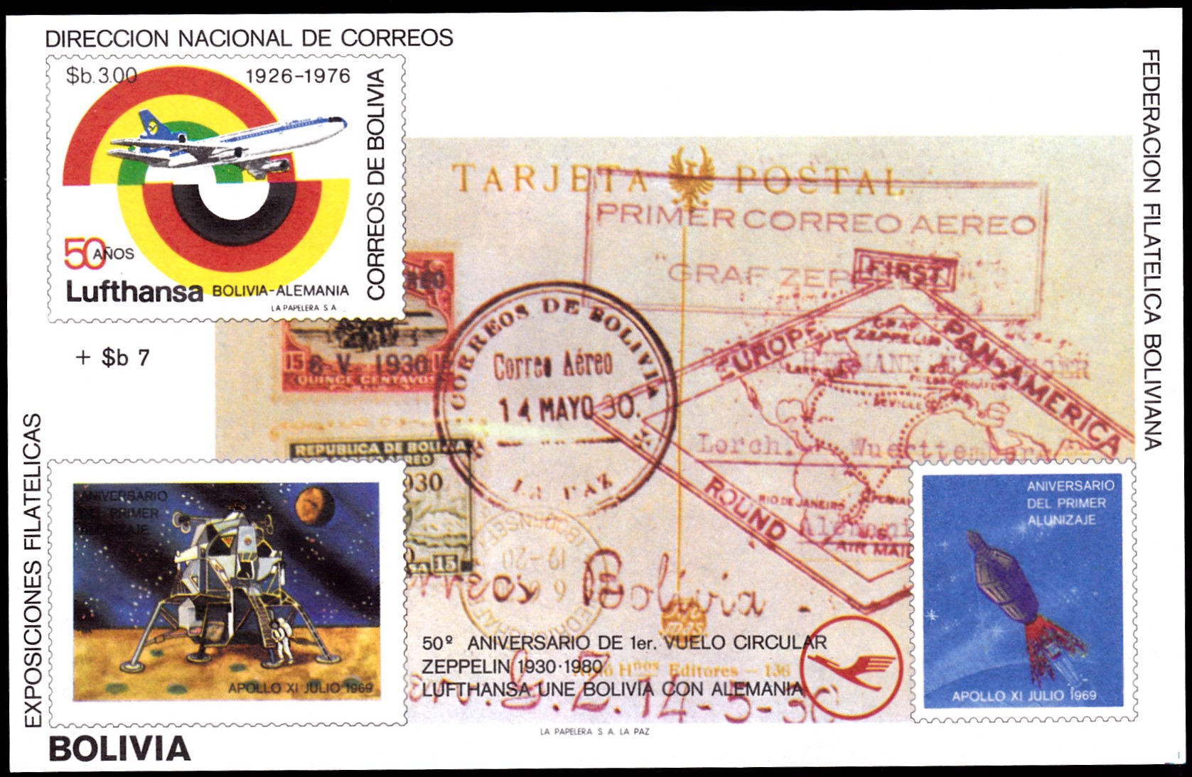 In Bolivien ist 1980 eine Blockausgabe (MiNr Block 105) zu dem 50. Jahrestag der ersten Zeppelin-Südamerikafahrt und dem 11. Jahrestag der ersten Mondlandung erschienen. Im Hintergrund des Blocks wird eine Reproduktion eines bolivianischen Zeppelin-Beleges zur Südamerikafahrt des Luftschiffes LZ-127 "Graf Zeppelin" im Jahre 1930 gezeigt.