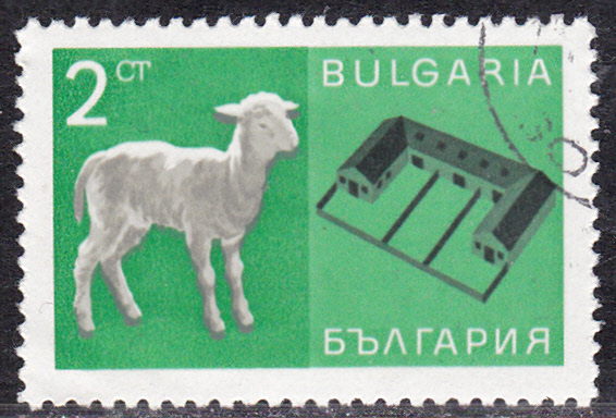Es folgt hier eine weitere Marke aus Bulgarien (MiNr 1727) mit einem Schaf. In der rechten Hälfte der Marke sehen wir auch Stallungen für die Schafzucht aus der Vogelperspektive.