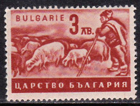 Marke aus Bulgarien (MiNr 420a) mit einem Hirten mit Schafherde, Diese Marke gibt es auch in rot (MiNr 420b).