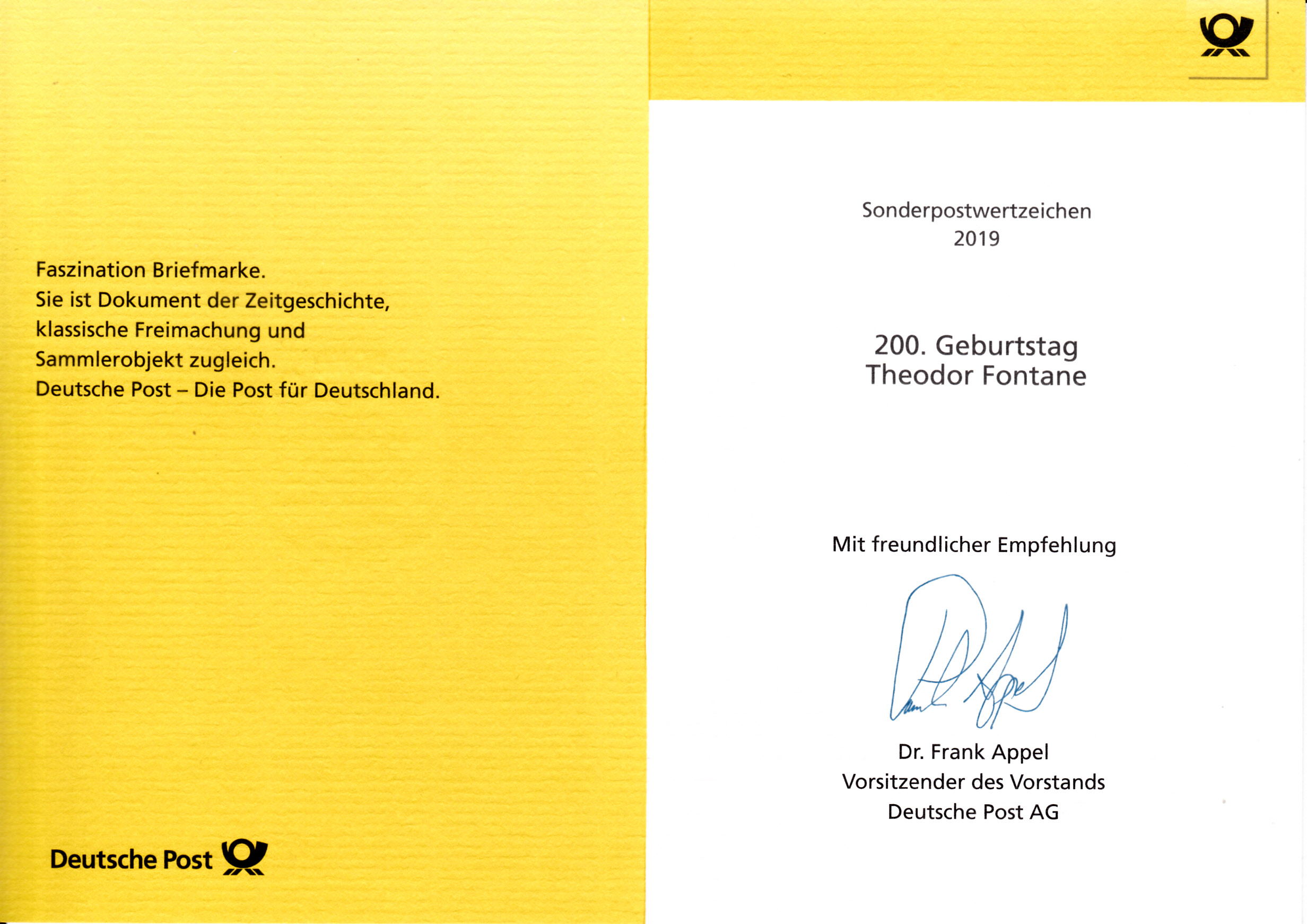 Klappkarte des Vorstandsvorsitzenden der Deutschen Post AG mit der Marke zum 200. Geburtstag von Theodor Fontane (MiNr 3508) und dem Ersttagsonderstempel Bonn.