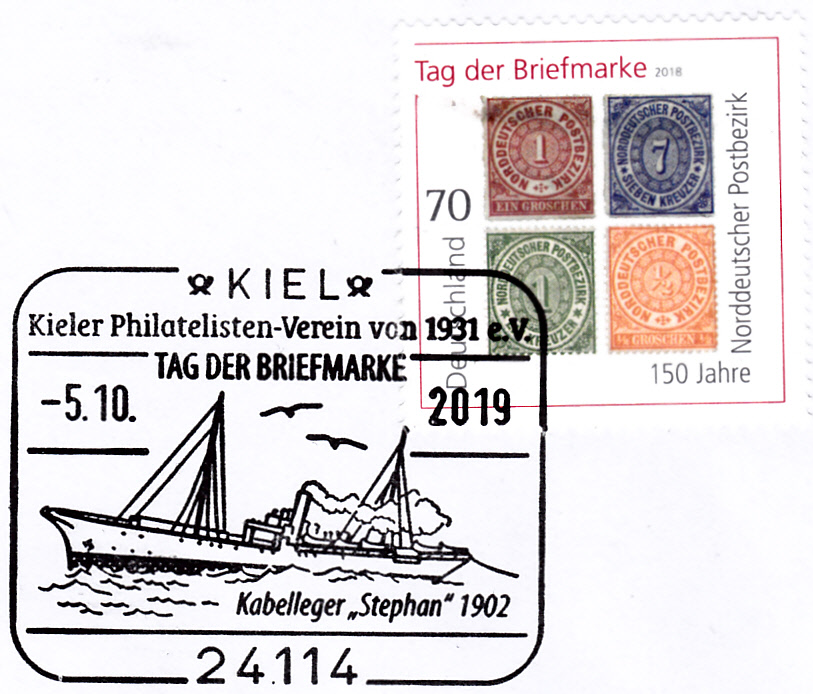Der Sonderstempel zum Tag der Briefmarke 2019 aus Iserlohn vom 6.10.2019 zeigt den Dantzturm und das Emblem des Verbandes der Philatelisten in Nordrhein-Westfalen.