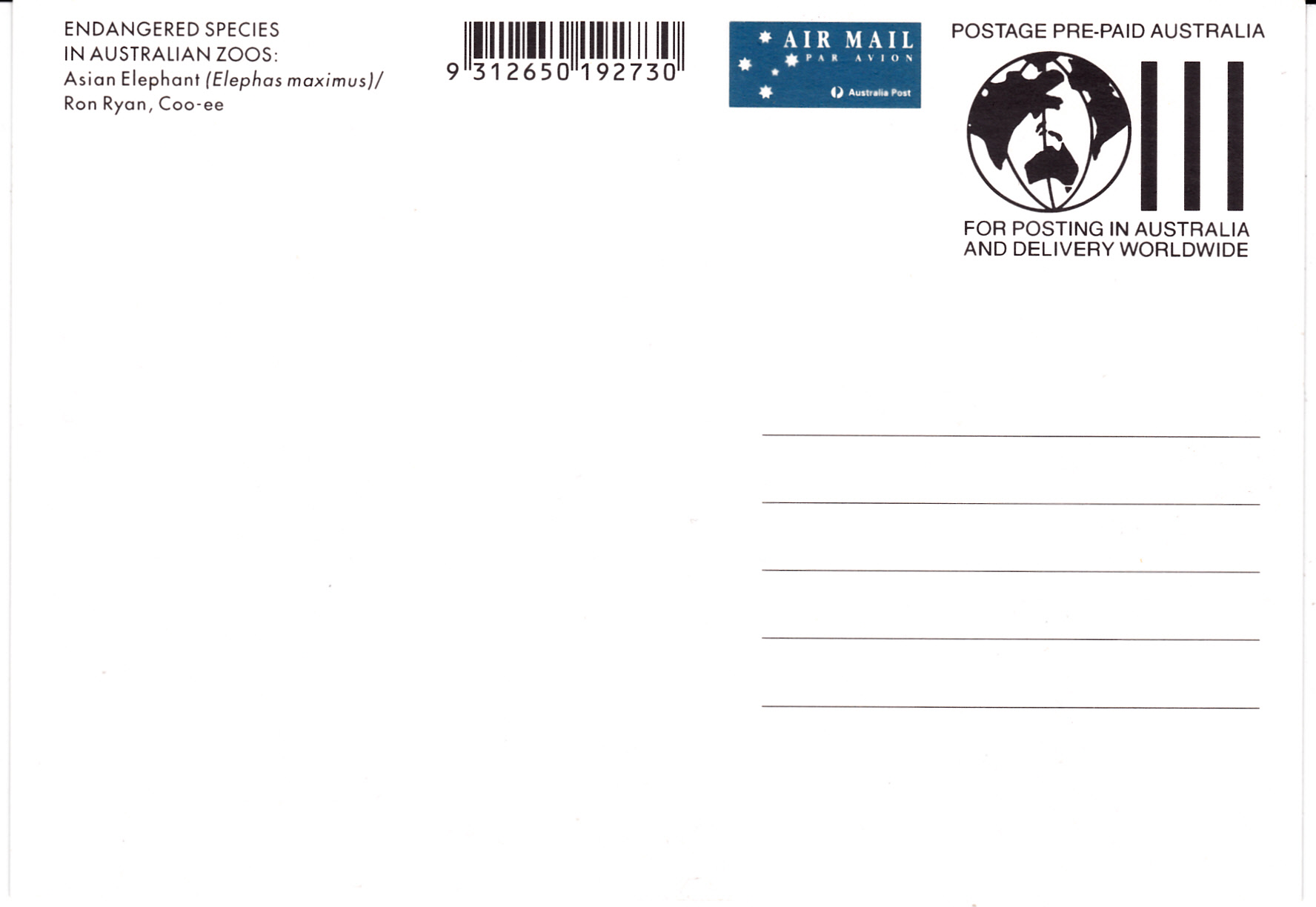 Auf der Bildseite einer Ganzsachenpostkarte der australischen Post wird eine hier bereits gezeigte Marke aus Australien (MiNr 1432) auch zusammen mit einem Foto von einem Asiatischen Elefanten (Elephas maximus) mit einem Jungtier abgebildet.
