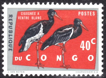 Auf dieser Marke (MiNr 141) aus Kongo (Kinshasa) sind zwei Abdimstörche (Ciconia abdimii) zu sehen.